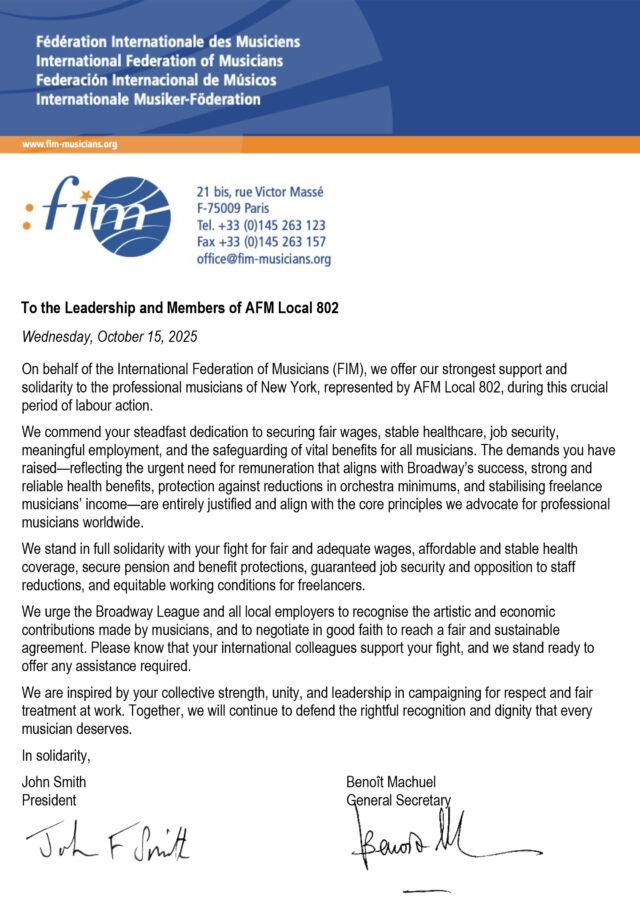 On behalf of the American Federation of Musicians, we thank the International Federation of Musicians (FIM) for their letter of support and commitment to solidarity with the professional musicians of AFM Local 802 in New York.