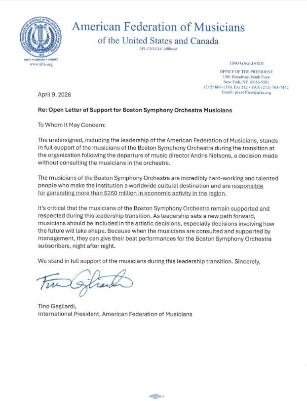 The undersigned, including the leadership of the American Federation of Musicians, stands in full support of the musicians of the Boston Symphony Orchestra during the transition at the organization following the departure of music director Andris Nelsons, a decision made without consulting the musicians in the orchestra.